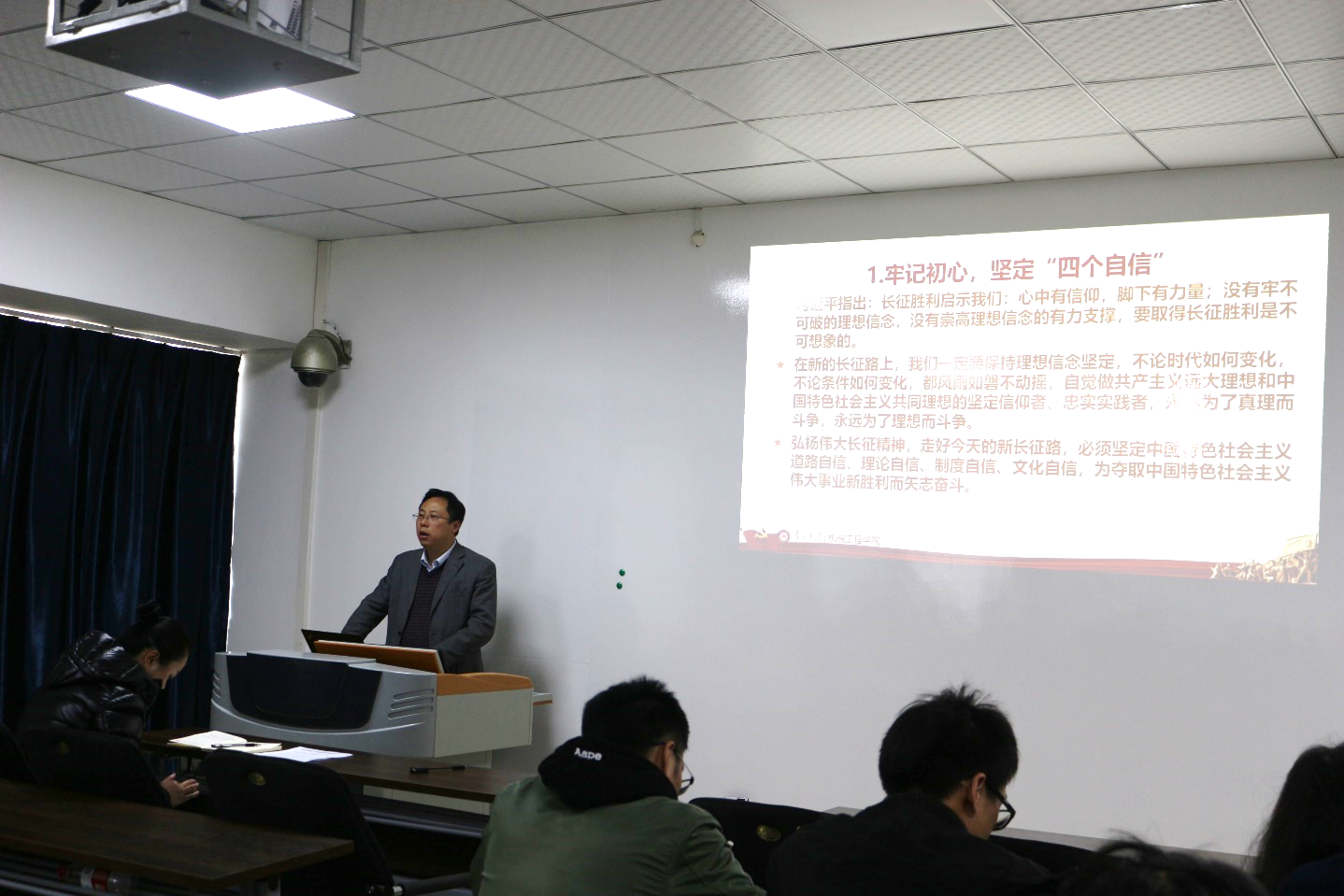 李少波院長(zhǎng)進(jìn)行了“不忘初心、牢記使命,弘揚(yáng)長(zhǎng)征精神,艱苦奮斗勇往直前,沖擊學(xué)科發(fā)展新高地”主題授課。他提出,我們黨員同志要不忘初心,在新的征程路上,弘揚(yáng)長(zhǎng)征精神,積極擔(dān)當(dāng)作為。一是要牢記初心堅(jiān)定“四個(gè)自信”;二是要堅(jiān)持實(shí)事求是認(rèn)真踐行“三嚴(yán)三實(shí)”的作風(fēng);三是要發(fā)揚(yáng)無私無畏敢于擔(dān)當(dāng)?shù)挠⑿壑髁x;四是要忠實(shí)踐行宗旨和黨的群眾路線;五是要強(qiáng)化“四個(gè)意識(shí)”堅(jiān)決維護(hù)黨的團(tuán)結(jié)統(tǒng)一;六是要大力弘揚(yáng)艱苦奮斗勤儉節(jié)約的光榮傳統(tǒng);七是要始終堅(jiān)持中國(guó)共產(chǎn)黨的領(lǐng)導(dǎo)。新時(shí)代開啟新征程,新征程呼喚新?lián)?dāng)新作為。我們要以高度的政治責(zé)任感和歷史使命感,抓好擔(dān)當(dāng)作為的落實(shí)落地;要弘揚(yáng)長(zhǎng)征精神,艱苦奮斗勇往直前,追求一流,沖擊學(xué)科發(fā)展新高地。