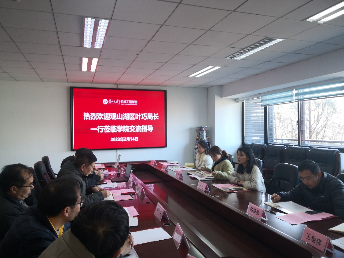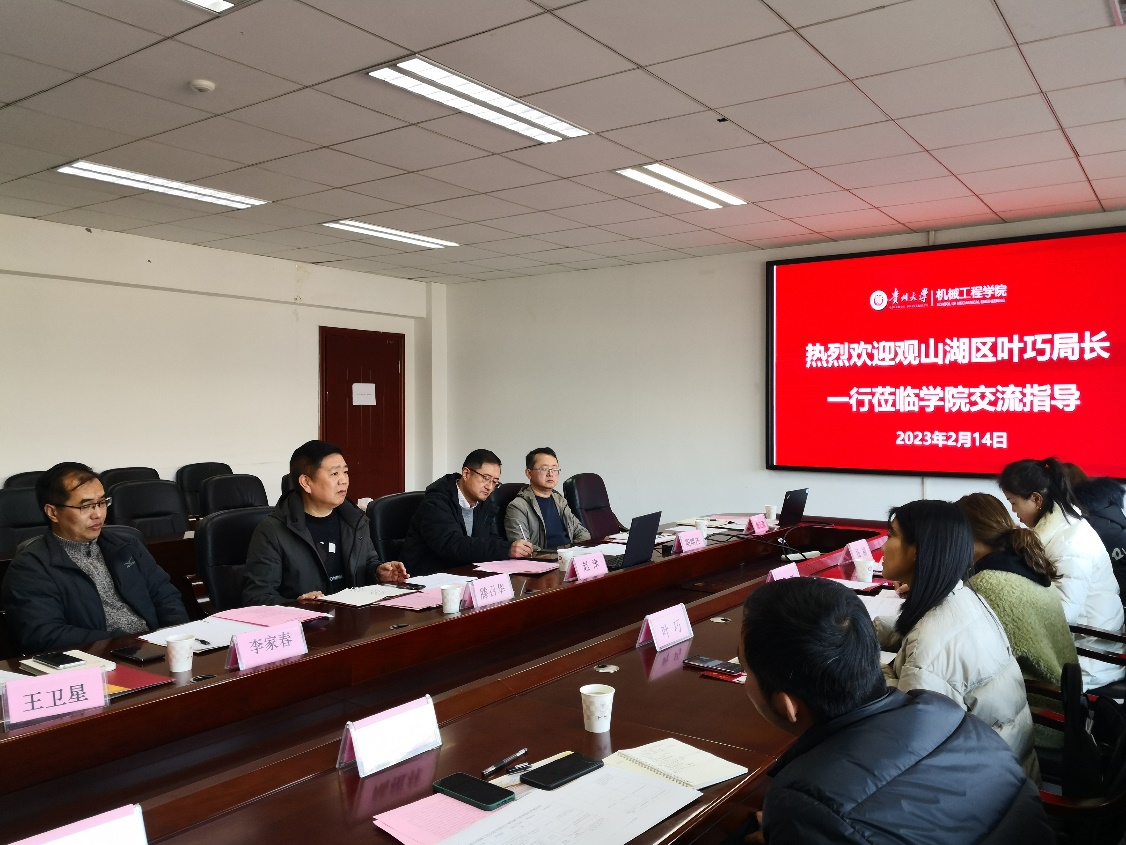 2023年2月14日下午,貴州大學(xué)機(jī)械工程學(xué)院與貴陽(yáng)市觀山湖區(qū)科學(xué)技術(shù)局、觀山湖區(qū)工業(yè)和信息化局、觀山湖區(qū)人力資源和社會(huì)保障局在機(jī)械樓518會(huì)議室舉行合作交流會(huì)議。觀山湖區(qū)科學(xué)技術(shù)局黨組書記、局長(zhǎng)葉巧,觀山湖區(qū)工業(yè)和信息化局企業(yè)管理服務(wù)科陸植林科長(zhǎng),觀山湖區(qū)人力資源和社會(huì)保障局就業(yè)服務(wù)科李昕科長(zhǎng)等出席了會(huì)議。機(jī)械工程學(xué)院黨委書記滕召華、機(jī)械工程學(xué)院趙津院長(zhǎng)、李家春副院長(zhǎng),以及各系室主任和青年教師代表參加了會(huì)議。