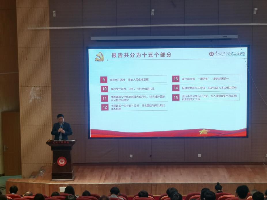 機械工程網站訊(記者朱漫華|攝影高鑫 路耀凌)為深入學習宣傳貫徹黨的二十大精神,教育引導學院黨員師生把思想和行動統(tǒng)一到黨的二十大精神上來,2023年4月14日中午,機械工程學院黨委書記滕召華在機械樓圓形報告廳為全院黨員師生作黨的二十大精神宣講。學院院長趙津、黨委副書記廖燁出席會議,學院教職工黨員和學生黨員參加宣講會。