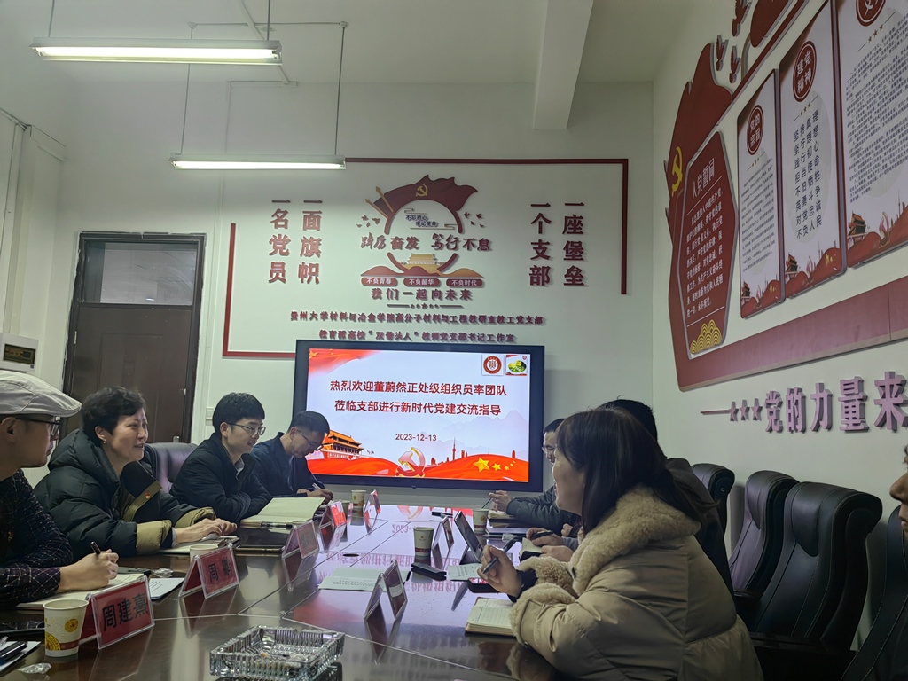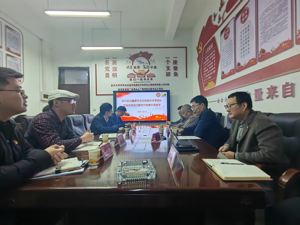 1213日,貴州大學(xué)黨委正處級組織員董蔚然攜我支部支委成員與材料與冶金學(xué)院高分子材料與工程教研室教工黨支部開展黨建交流。材料與冶金學(xué)院黨委書記劉劍、正處級組織員熊玉竹以及高分子材料與工程教研室教工黨支部全體黨員參加活動。活動由全國高?!半p帶頭人”教師黨支部書記工作室負(fù)責(zé)人、高分子材料與工程教研室教工黨支部書記謝海波主持。
